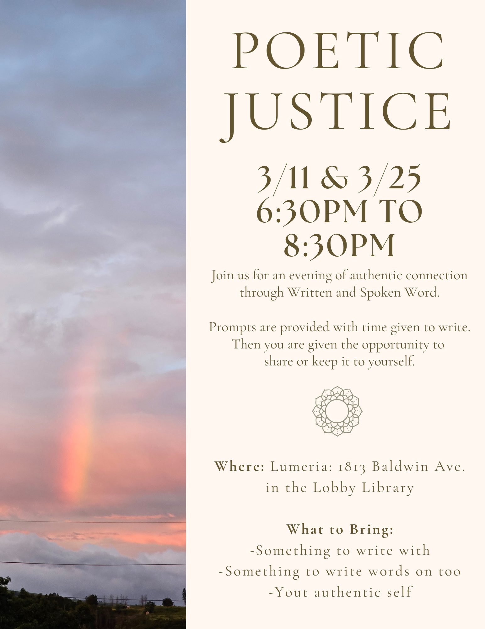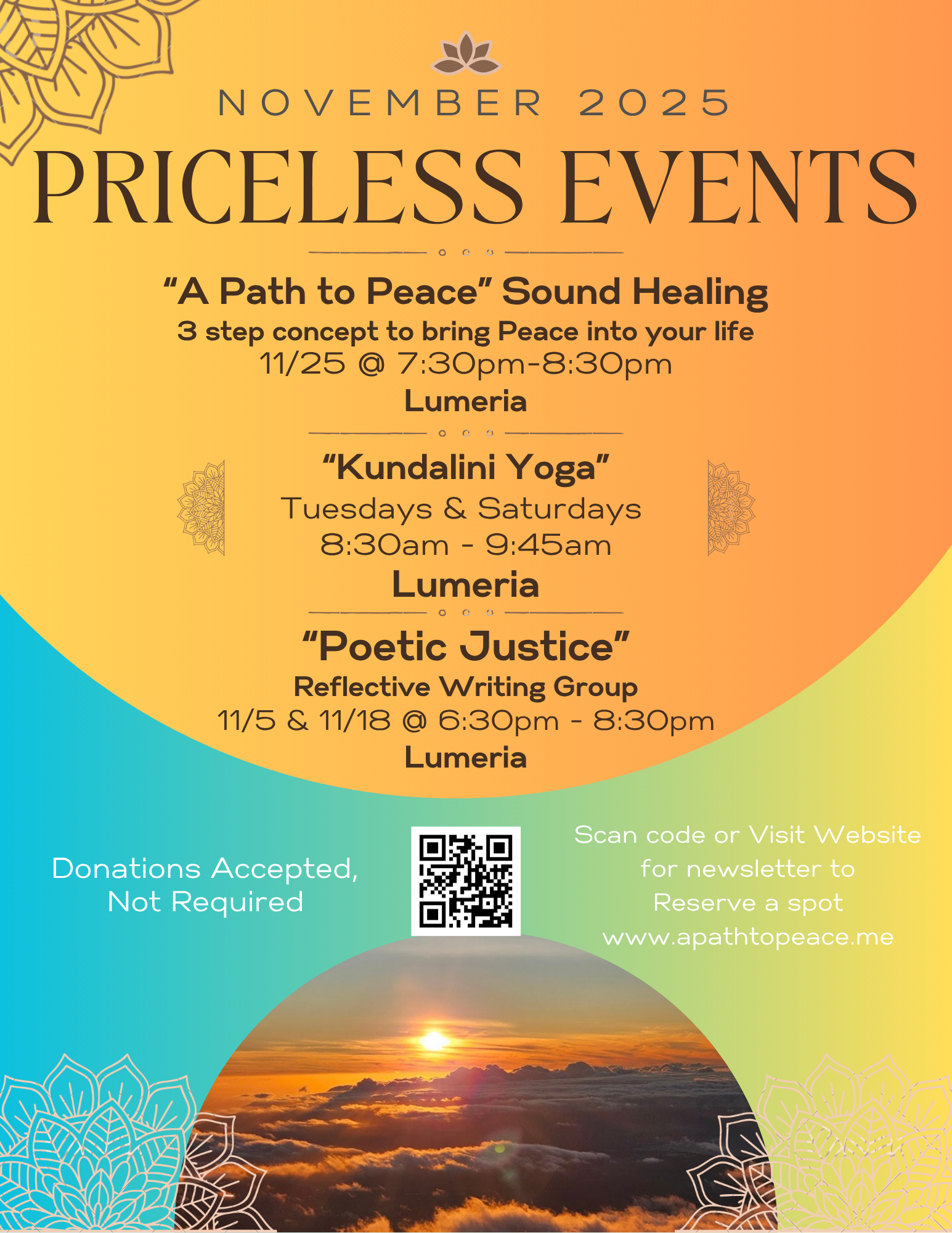Schedule can be found on monthly newsletter or Lumeria website.